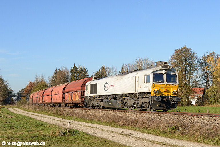 ECR 247 054 bringt im Rahmen des Umleiterverkehrs Burghausen (bedingt durch die Streckensperre Mühldorf - Tüßling) einen kurzen Güterzug von Burghausen nach Freilassing (Tittmoning-Wiesmühl, 03.11.2015).