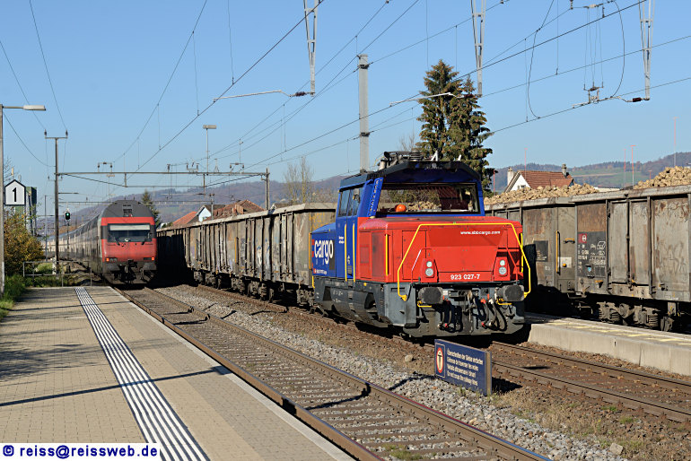 Eem 923 027 "Montagne de Boujean" schiebt mit gesenktem Stromabnehmer und aktivem Dieselmotor Leerwagen in den Anschluss Bürglen, während links IC 818 Romanshorn - Brig den Bahnhof passiert (05.11.2015).