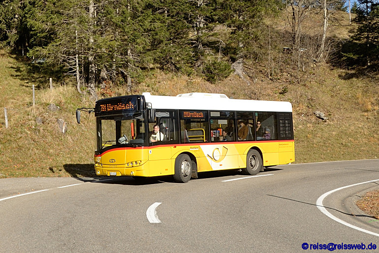 | Solaris Urbino 8.6 übernimmt den regulären Kurs 10:17 Uhr Schwägalp - Urnäsch, während der nachfolgende Anhängerzug als Dienstfahrt in die Pause fährt und erst wieder 11:47 Uhr in den Einsatz geht. Aufnahme in der obersten Kehre der Schwägalp-Strasse (08.11.2015). |
