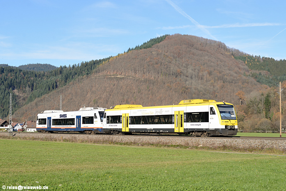 SWEG VT 526 (in den Landesfarben) und VT 504 (noch in den SWEG-Farben) sind am 12.11.2015 als SWE 87391 von Offenburg nach Hornberg unterwegs, aufgenommen kurz vor dem Haltepunkt Gutach (Freilichtmuseum).