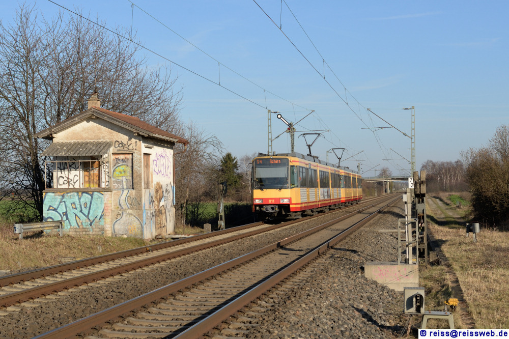 Eine AVG-Doppelgarnitur mit Wagen 811 an der Spitze passiert die aufgelassene Blockstelle Bashaide mit einer S4 nach Achern. (26.12.2015).