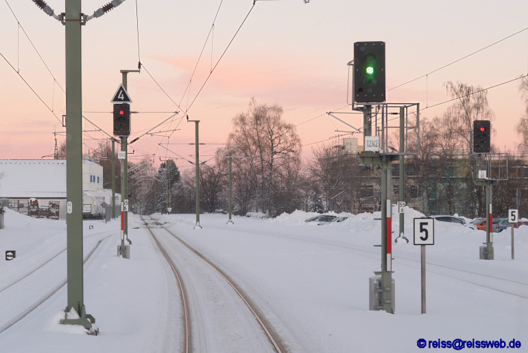 Ausfahrt aus Freudenstadt Stadt (738 m. ü.d.M.) hinunter nach Freudenstadt Hbf (664 m. ü.d.M.). Steigung bzw. Gefälle betragen bis zu 45 ‰ (20.01.2016)