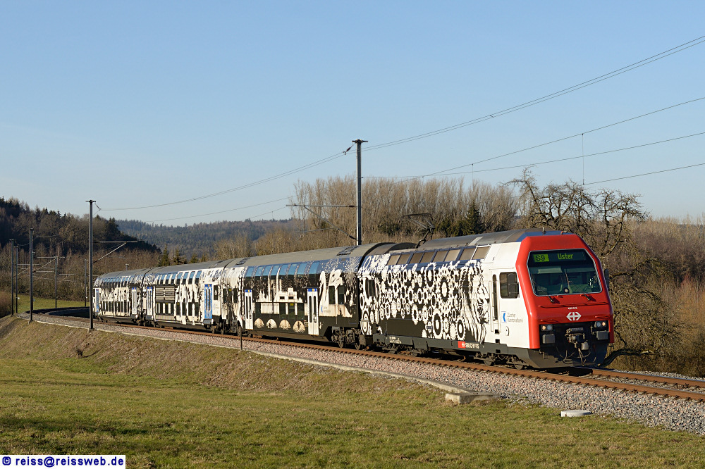 450 016 "Zürcher Kantonalbank [ZKB]" ist als S9 18959 von Schaffhausen nach Uster unterwegs, aufgenommen zwischen Jestetten und Lottstetten (26.01.2016).