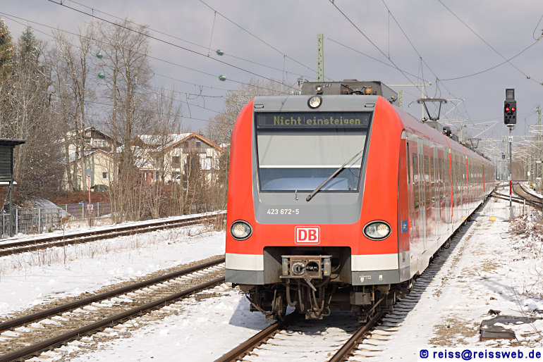 423 172 672 und ein weiteres Fahrzeug erreichen als S3 ihren Zielbahnhof Deisenhofen (26.02.2016).