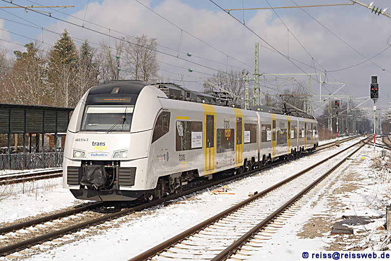 Seit dem Zusammenstoß von Bad Aibling fehlen dem Meridian zwei Fahrzeuge. Als Aushilfe wurde ein Desiro ML (460 014 / 514) von der Mittelrheinbahn geholt. Beide Betreiber gehören zur selben Muttergesellschaft Transdev (Deisenhofen, 26.02.0216).