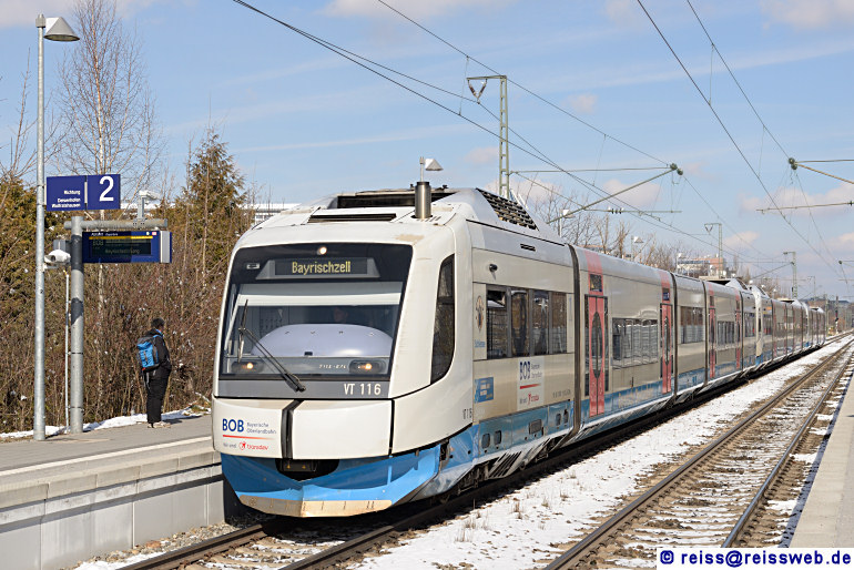 Drei Integral-Garnituren (VT 116 nach Bayrischzell, VT 106 nach Lenggries und VT 103 nach Tegernsee) Wurden beim Halt in München-Siemenswerke aufgenommen (26.02.2016).