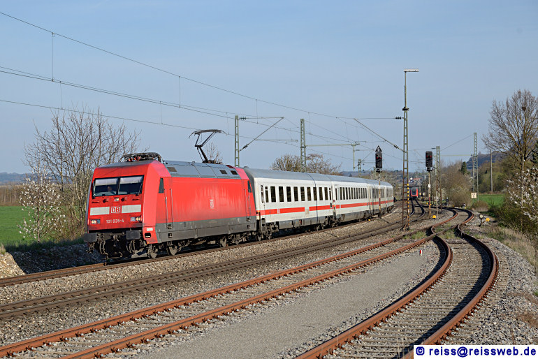 101 025 fährt mit vier IC-Wagen als "Ersatzzug" IC 932 von Singen nach Stuttgart, da die Strecke zwischen Singen und Thayngen (CH) wegen Gleisbauarbeiten den überwiegenden Teil des Tages gesperrt bleibt (Welschingen-Neuhausen, 10.04.2016).