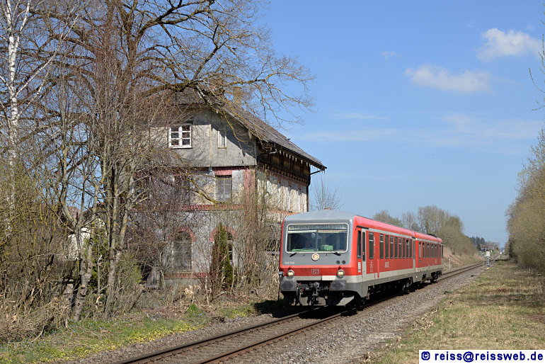 628/928 549 fährt als RB 22894 Aichstetten - Wangen durch den ehemaligen Bahnhof Gebrazhofen (11.04.2016).