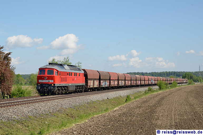 232 618 bringt den "Roßberger" (Kies aus dem Wolfegger Ortsteil Roßberg) nach Friedrichshafen. Die Aufnahme entstand bei Mochenwangen (18.05.2016).