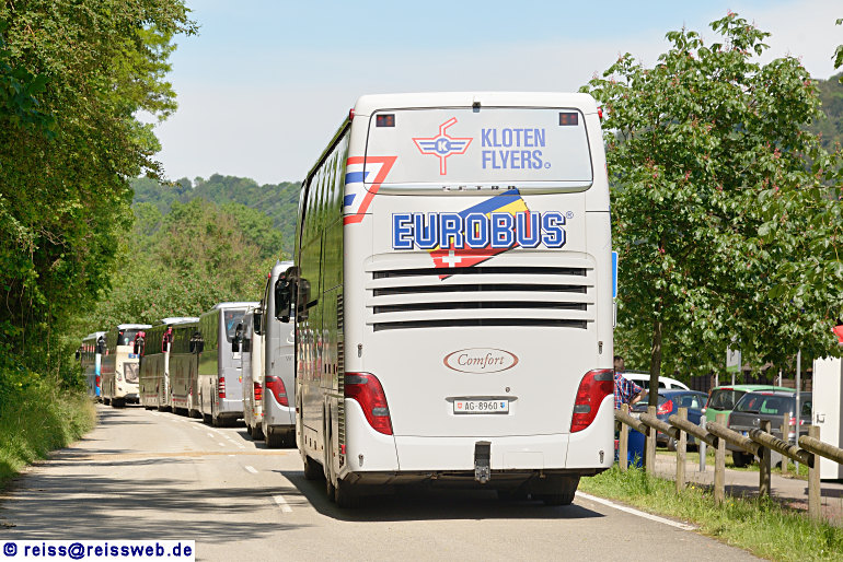 Mehrere Reisebusse warten in Weizen auf die Ankunft des Zuges aus Zollhaus-Blumberg, um ihre Fahrgäste wieder aufzunehmen. Ein - auch in umgekehrter Richtung - gängiges Vorgehen, um die Sauschwänzlebahn in eine Busreise zu integrieren (09.06.2016).