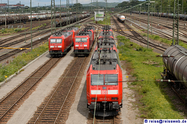 Im Rangierbahnhof Karlsruhe warten (v.l.n.r.) 145 064 u. 041, daneben 185 262 u. eine unbekannte Nummer sowie auf dem rechten Gleis 185 054, 185 155, 152 111 und 185 172 auf ihre nächsten Einätze (13.06.2016).
