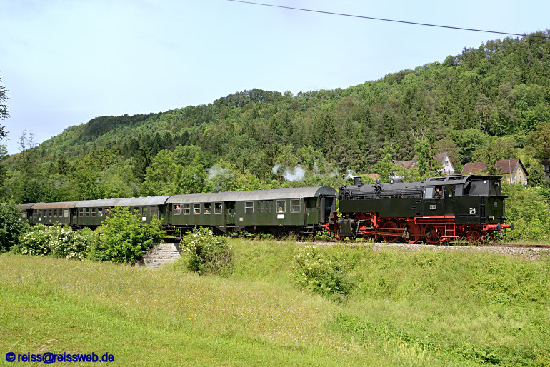 FK 262 der Bahnbetriebe Blumberg hat den Haltepunkt Lausheim-Blumegg verlassen und fährt weiter nach Weizen. Im Hintergrund die Ortschaft Grimmelshofen (17.06.2016).