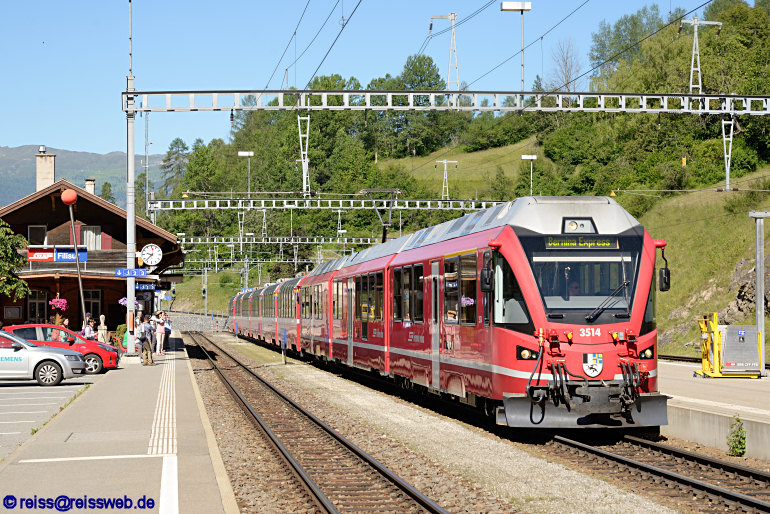 Allegra ABe 8/12 3514 erreicht mit dem Bernina-Express Chur - Tirano die Station Filisur (23.06.2016).