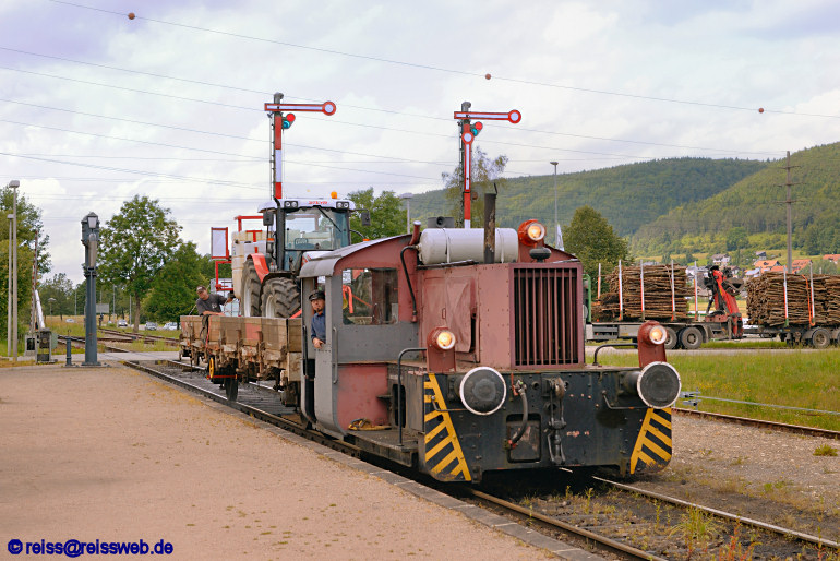 Mit einfachen Mitteln kommt auch die Sauschwänzlebahn zu einem Spritzzug. Der bahneigene Traktor fährt in Fützen über die Kopframpe auf einen Flachwagen und wird von der Köf II (ex