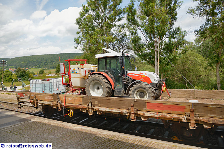 Mit einfachen Mitteln kommt auch die Sauschwänzlebahn zu einem Spritzzug. Der bahneigene Traktor fährt in Fützen über die Kopframpe auf einen Flachwagen und wird von der Köf II (ex 322 660) über die Strecke gezogen (Blumberg, 29.06.2016).