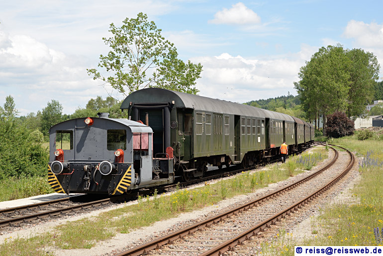 Köf II (ex 322 660) der Sauschwänzlebahn hat sich in Blumberg an die abgestellten Reisezugwagen gesetzt, um eine Bremsprobe durchzuführen (29.06.2016).