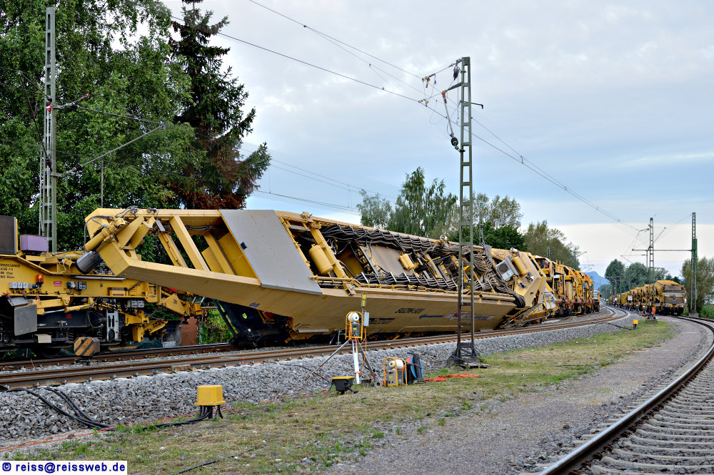 Am 08.07.2016 gegen 14:00 Uhr kippte der Schnellumbauzug SUZW-500 von Wiebe am westlichen Ende des Bahnhofs Radolfzell ins Gegengleis. Die Strecke nach Singen war zwei Tage komplett gesperrt. Hier die Situation am 09.07. um 06:20 Uhr.