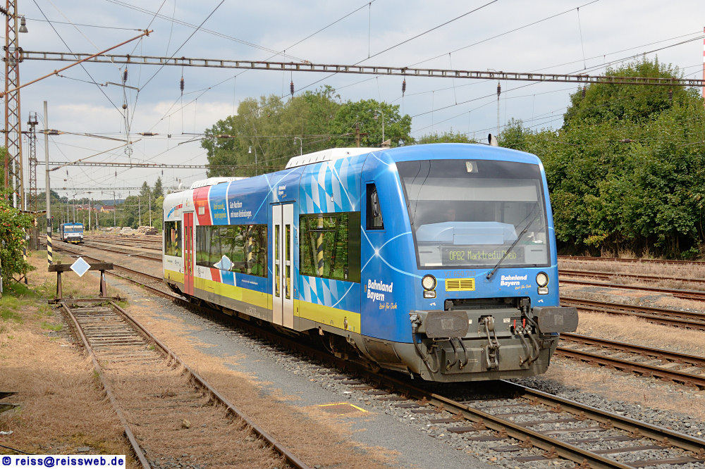 VT 650.703 von Agilis fährt mit Werbung für deutsch-tschechische Nachbarschaft aus Franzensbad (Františkovy Lázně) aus. Ziel ist Marktredwitz, das über Eger (Cheb) und den Übergang Schirnding erreicht wird (01.09.2016).