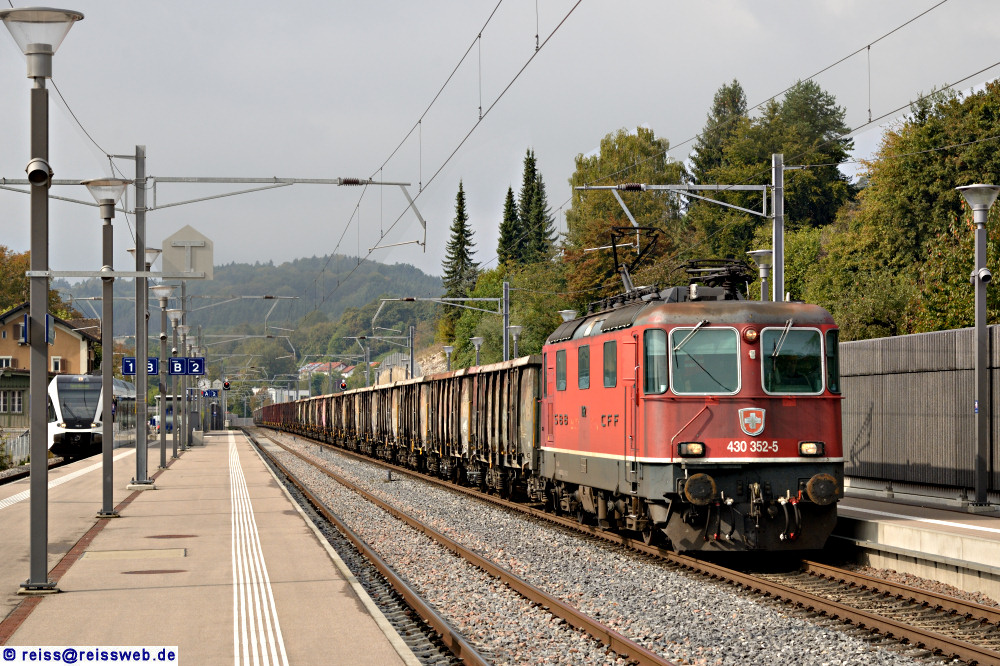 Den dritten Leerzug des Tages zur Beladung mit Biorüben brachte 430 352 von Islikon (Anschluss Zuckerfabrik) nach Singen. Mit 850 to und einer Länge von 506 m war er auch ohne Beladung mit respektablen Abmessungen unterwegs (Jestetten, 27.09.2016).