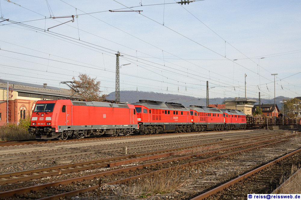 185 392 von DB Cargo bringt im Zug EK 56182 neben der normalen Last noch drei Diesellokomotiven der Baureihe 232 (093, 569 & 201) von Ulm nach Kornwestheim (Süßen, 01.11.2016).