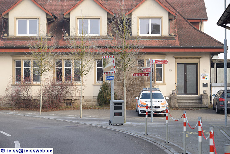 Blitzer beim Bahnhof Wilchingen-Hallau in einer kurzen - ca. 125 m langen - 30er Zone. Der MB Vito steht rechts hinter der Ecke des Bahnhofsgebäudes (01.12.2016).