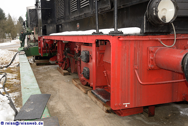 Um die Traversen unter der Lok wieder freizubekommen, musste die Lok in der verbreiterten Kesselbrücke zunächst auf Hölzern abgesetzt werden (Blumberg, 12.01.2017).