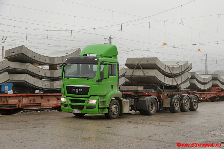 Tübbinge für den Rastatter Tunnel werden aus Neumarkt in der Oberpfalz auf der Schiene angeliefert und dann auf LKW zur Baustelle transportiert (Rastatt, 01.02.2017).