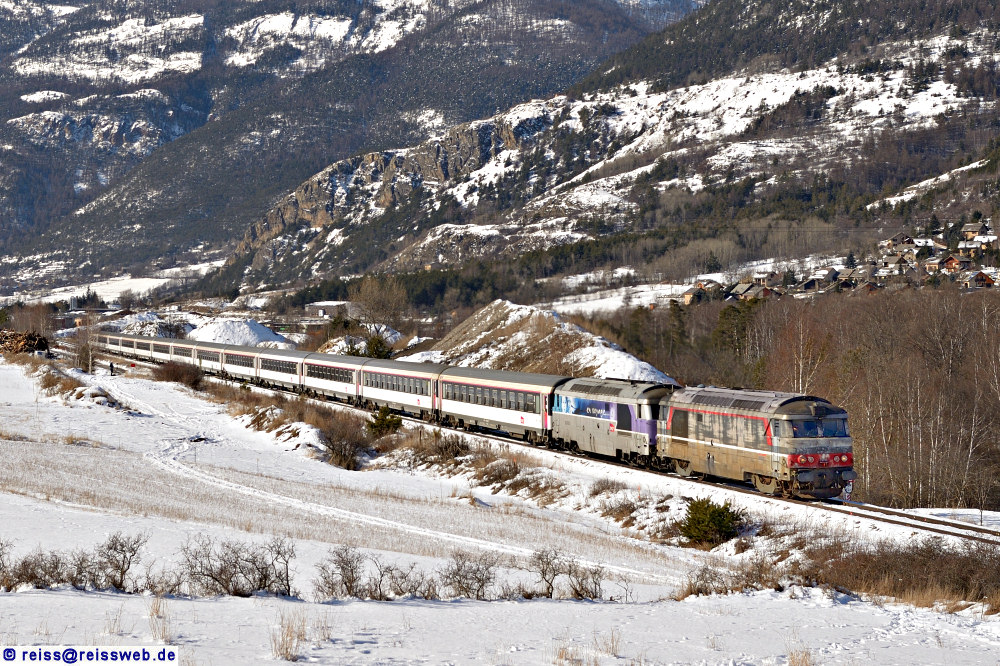 Der Nachtzug Paris Austerlitz - Briançon mit BB 67338 & 67450 wird in wenigen Minuten sein Ziel Briançon erreichen (11.02.2017).
