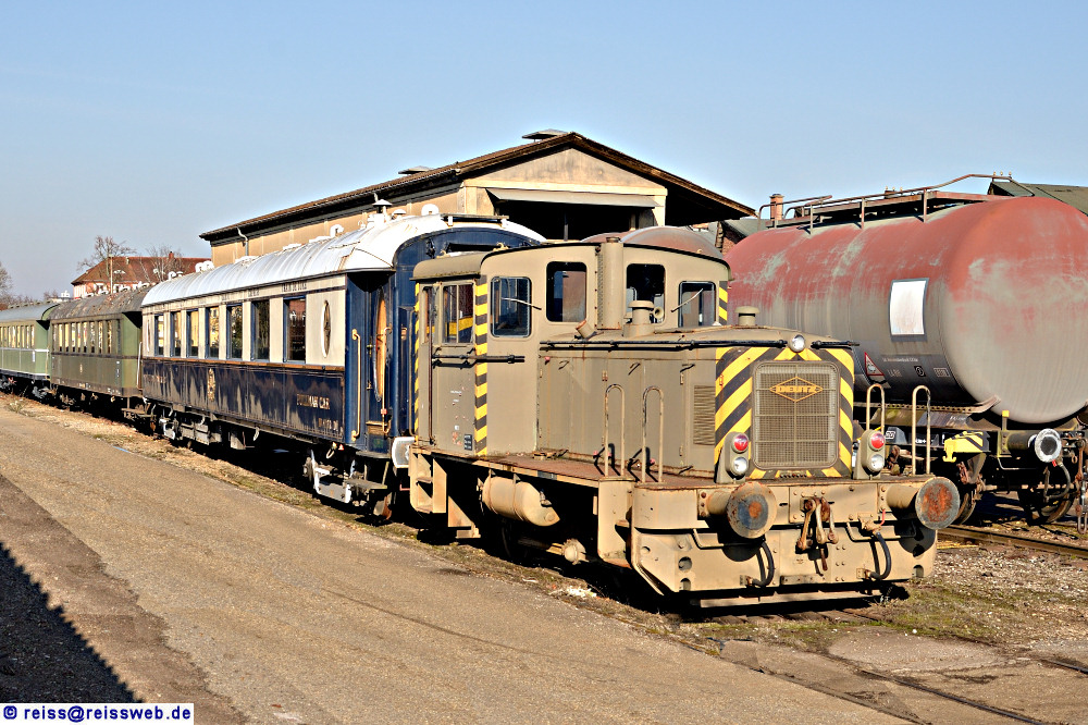 | Ein B-Kuppler (Deutz 57512/1962, KS 230 B) ex Fliegerhorst Diepholz steht bei der BWR Waggonreparatur GmbH in Rastatt. Dahinter der ex-CIWL-Wagen 4152 mit einem bemerkenswerten UIC-Raster. Laut einer Sichtung standen beide im Juli 2014 an selber Stelle (16.02.2017). |