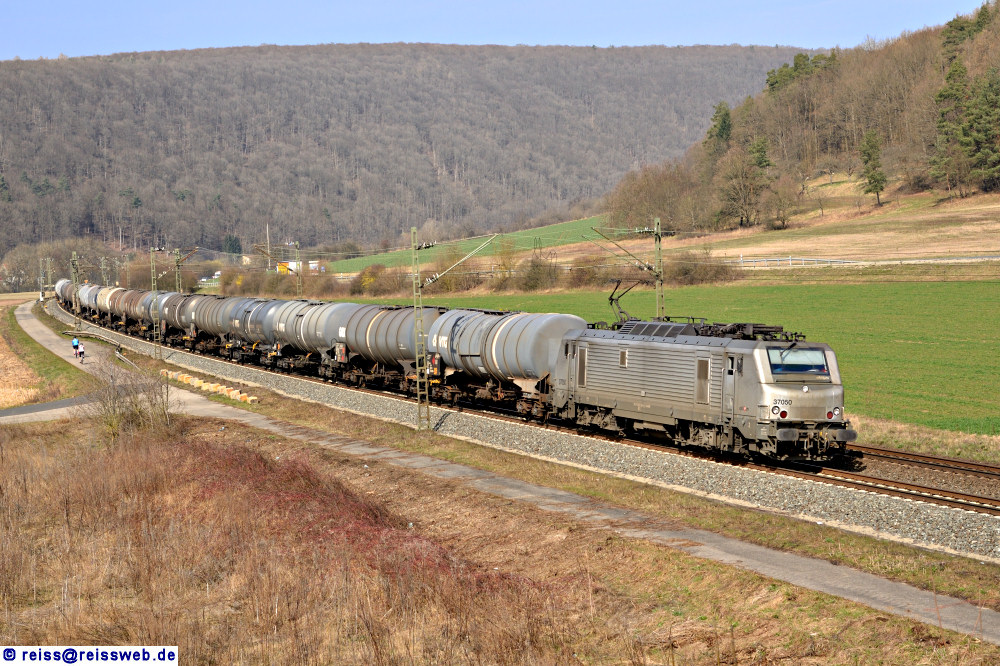 Akiem BB 37050 bringt einen Kesselwagenzug durch das Maintal Richtung Süden (Wernfeld, 16.03.2017).