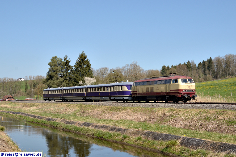 NESA 218 105 bringt den Schnelltriebwagen SVT 137 234 "Leipzig" von Delitzsch nach Friedrichshafen Hafenbahnhof, wo er im Rahmen einer Ausstellung gezeigt wird (Schussentobel, 09.04.2017).