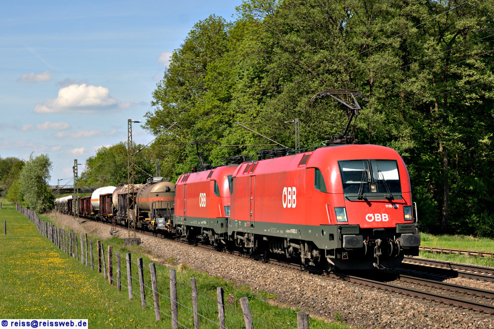 ÖBB Cargo 1116 052 & 053 bringen einen gemischten Güterzug südwärts, aufgenommen beim BÜ Vogl (Großkarolinenfeld, 16.05.2017).