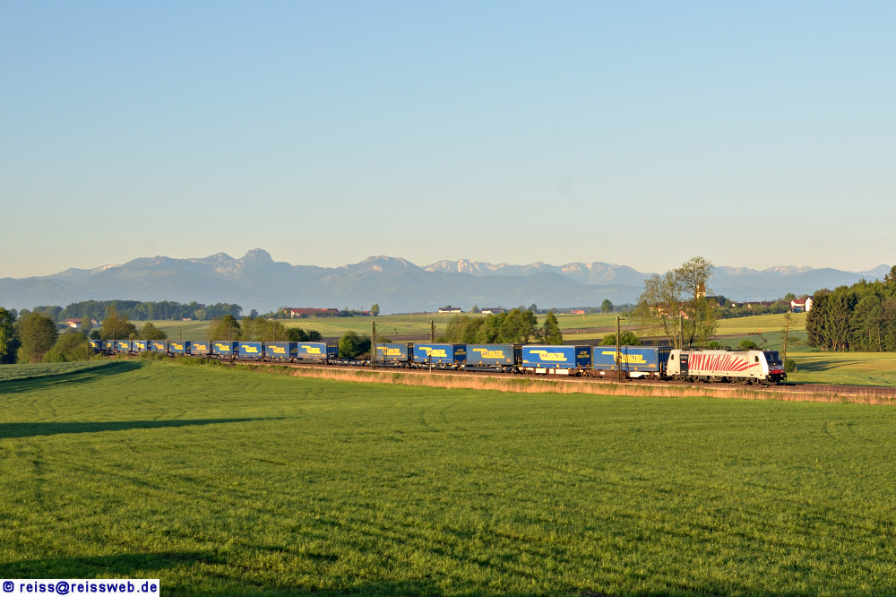 Eine Dreiviertelstunde nach Sonnenaufgang fährt Lokomotion 186 285 durch Haus (Gemeinde Ostermünchen) mit einem UKV-Zug Richtung München (18.05.2017).