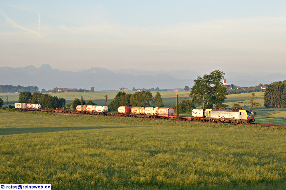 Um 05:48 Uhr passiert BLS 475 404 (derzeit an Lokomotion vermietet) mit einem UKV-Zug die Fotostelle im Ostermüchner Ortsteil Haus in Richtung München (15.06.2017).