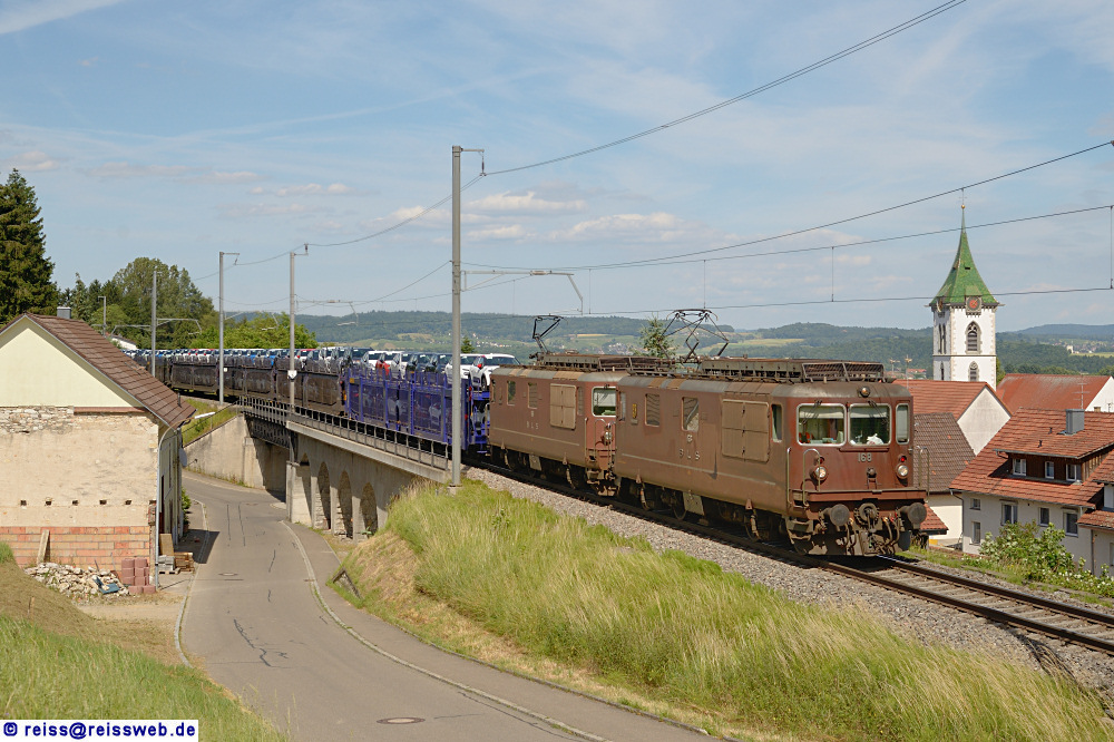 BLS Re 4/4 168 & 195 bringen einen umgeleiteten Autozug von Singen nach Basel (Lottstetten, 16.06.2017)