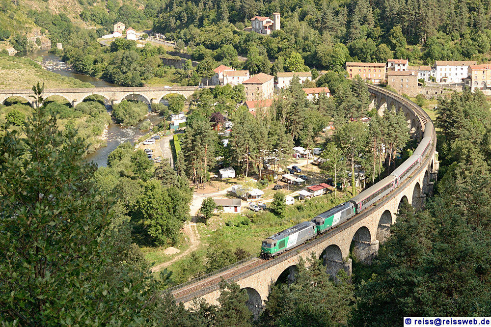 Ausnahmsweise mit den Lokomotiven BB 67579 & 67503 von SNCF Fret bespannt fährt Intercité 15952 "Le Cévenol" Nîmes - Clermont-Ferrand über das Viadukt von Chapeauroux (14.08.2017).