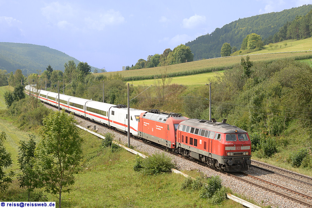 Die Mühldorfer 218 463 überführt 101 108 und ICE 401 076 / 576 von Villingen über die Donautalbahn nach Ulm und weiter nach München Laim Rbf (Immendingen, 28.08.2017).