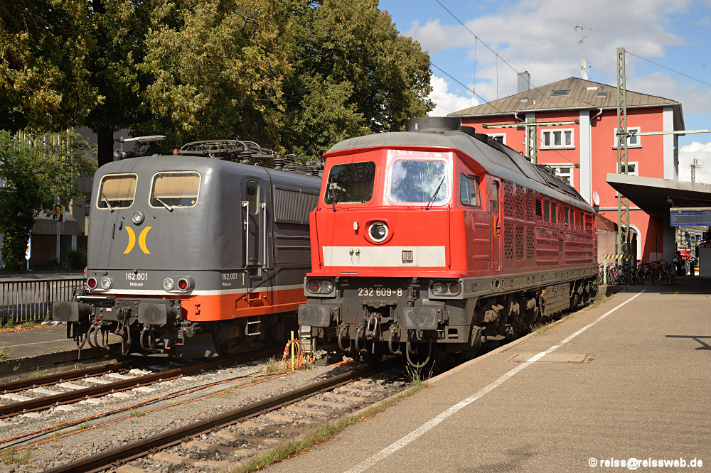 162.001 "Mabuse" von Hectorrail & 232 609 von DB Cargo warten im Rahmen der Umleiterverkehre "Rastatt" am Abend des 06.09.2017 in Singen (Hohentwiel) auf ihre nächsten Dienste.