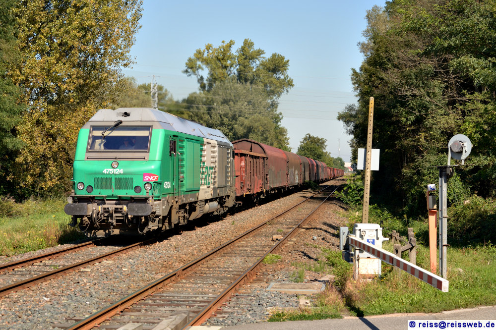 SNCF BB 75124 bringt einen wegen des Unterbruchs in Rastatt umgeleiteten Güterzug von Wörth via Lauterbourg nach Strasbourg (Lauterbourg, 21.09.2017).