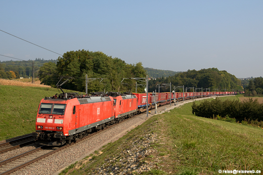 185 093 & 089 von DB Cargo bringen den wegen des Unterbruchs in Rastatt umgeleiteten "Winner-Zug" von Singen nach Süden (Jestetten, 24.09.2017).