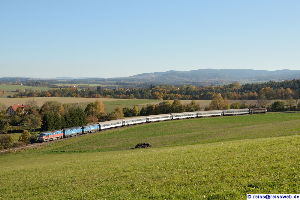Vier Maschinen der Baureihen 749 u. 751 von ČD Cargo (751 316, 749 018, 751 219 und am Zugende 749 019) bespannten die Rückleistung eines Militärzuges von Polečnice nach České Budějovice (Plešovice, 15.10.2017).