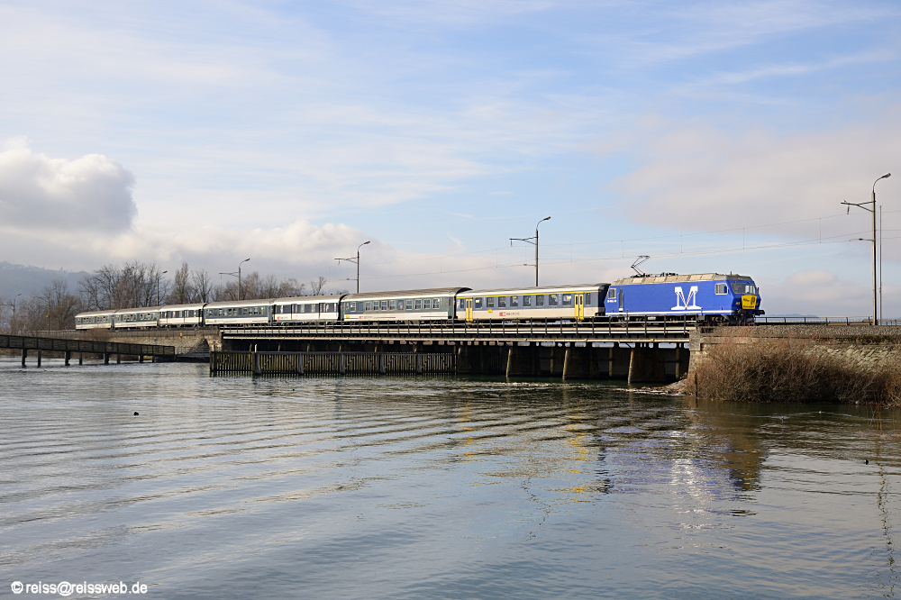 Die Höfner Narrenfahrt 2018 mit der von der SOB angemieteten M-Rail 456 111 an der Spitze überquert den Seedamm zwischen Pfäffikon und Rapperswil (Hurden, 06.01.2018).