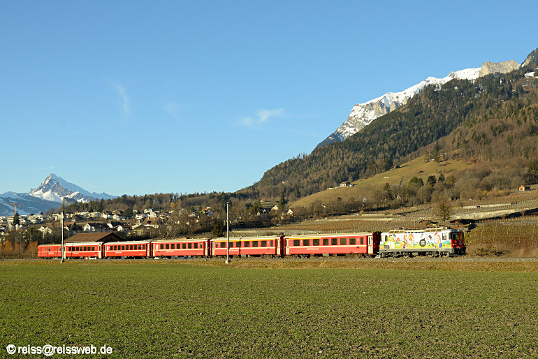 Ge 4/4 II 611 "Login" bringt RE 1253 von Disentis nach Scuol-Tarasp (Malans, 29.01.2018).