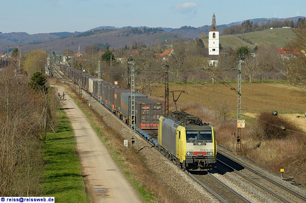 MRCE 189 993, eine der letzten Maschinen in "Dispolok"-Farben, bringt einen KV-Zug nach Süden (Denzlingen, 21.03.2018).
