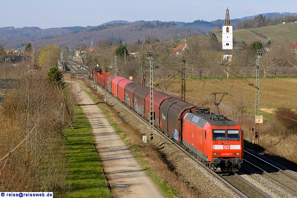 DB Cargo 145 030 bringt einen kurzen gemischten Güterzug nach Basel (Denzlingen, 21.03.2018).