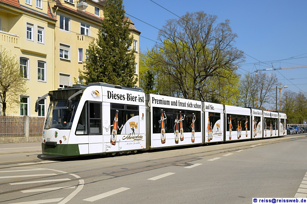 Combino NF8 853 "Schwarzbräu" fährt auf der Augsburger Linie 1 Richtung Endhaltestelle Göggingen (18.04.2018).