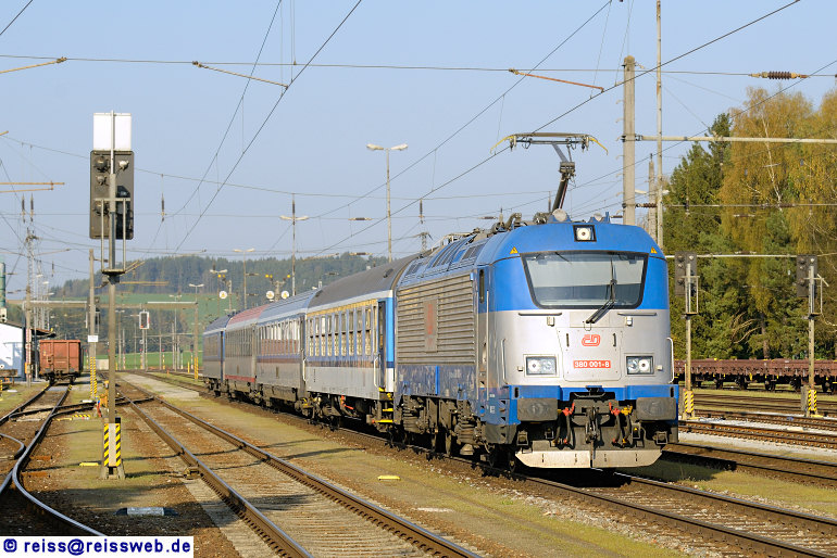 380 001 von České Dráhy verlässt mit der ersten Verbindung des Tages zwischen Linz und Prag den Grenzbahnhof Summerau (19.04.2018).