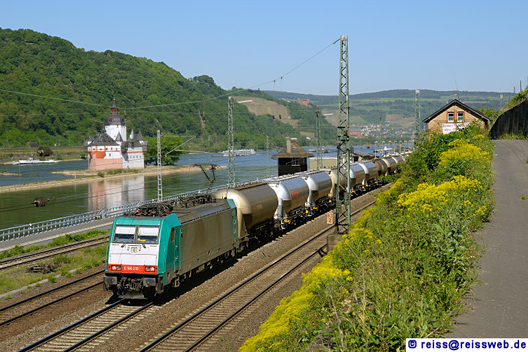 ATC 186 210 führt einen ZUg mit Staubgut-Transportwagen durch Kaub Richtung Süden (08.05.2018).