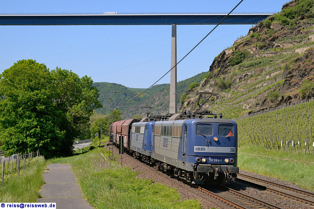 RBH 266 & 274 bringen einen leeren Kohle- oder Erzpendel aus dem Saargebiet zurück nach Norden, aufgenommen unter der Moseltalbrücke im Zuge der Autobahn A61 (Winningen, 08.05.2018).