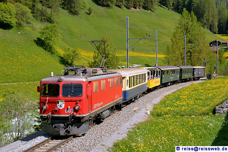 | Vom 10. Mai bis 28. Oktober 2018 werden zwei Zugpaare zwischen Davos und Filisur mit einer historischen Komposition gefahren, normalerweise ist Ge 6/6 I 414 vorgespannt. Wird ein Unterhalt fällig, kommt eine Ge 4/4 I zum Einsatz (Davos Glaris, 25.05.2018). |
